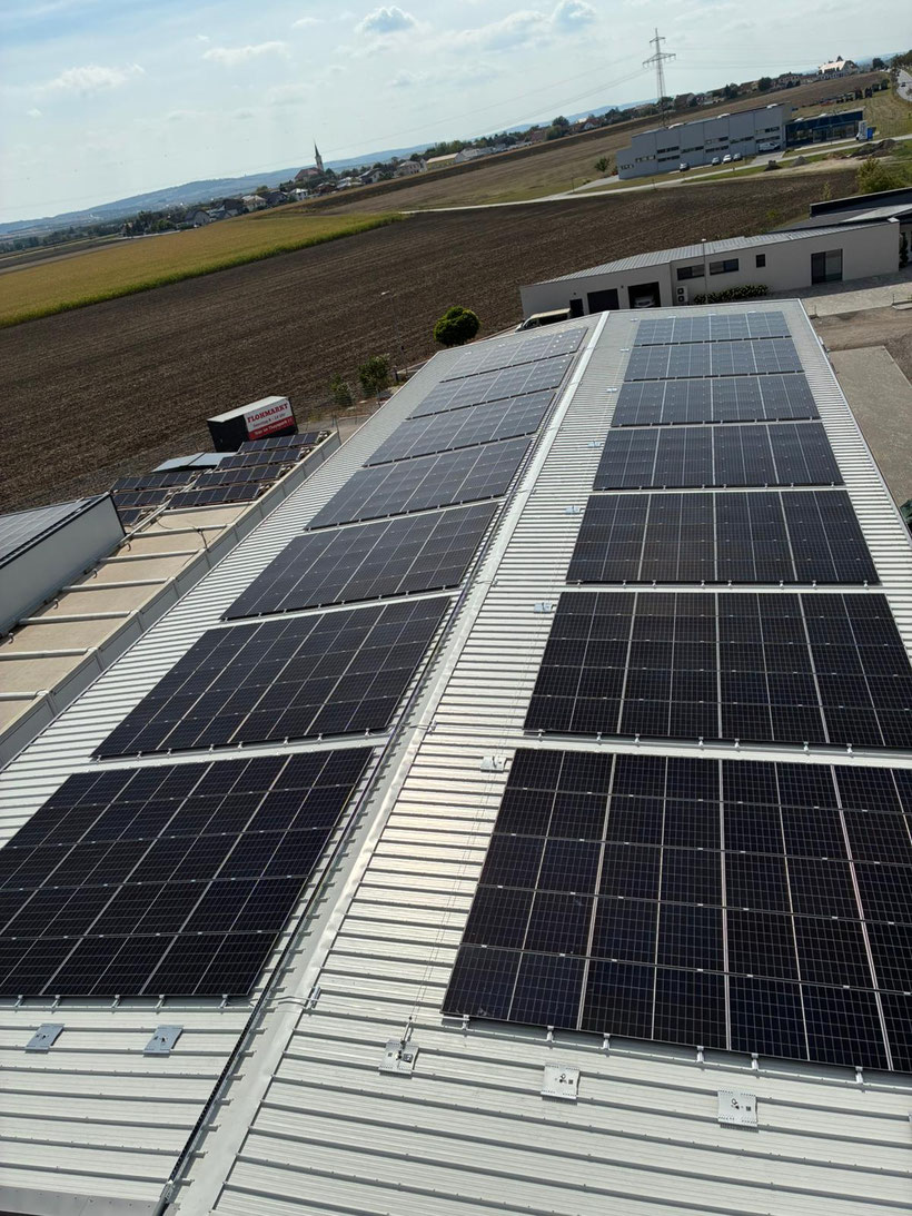 142 kWp am Dach der AS-tech GmbH. Errichtet 2021 und speist den 100kW Charger, der öffentlich zugängig ist